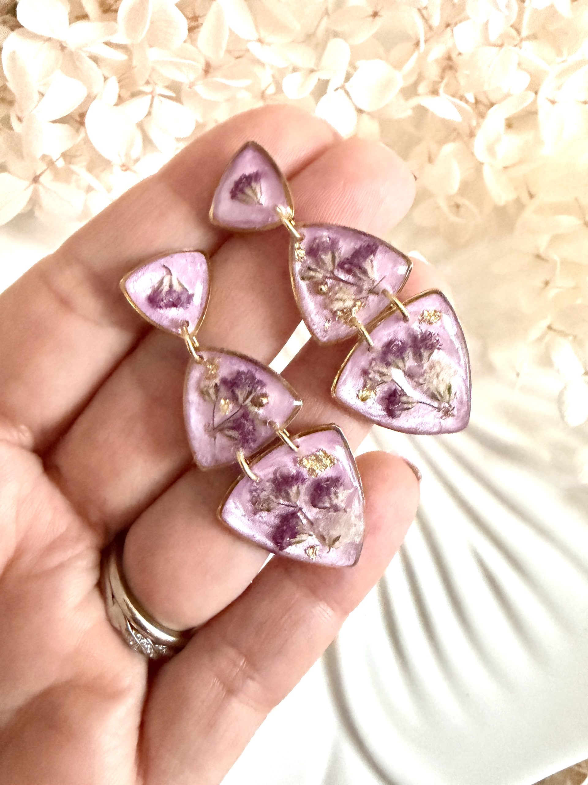 Tento šperk je dôkazom toho, že v jednoduchosti je krása. Fialkový perleťový podklad spolu s gypsomilkou vytvára čistý a minimalistický vzhľad. Gypsomilka symbolizuje čistotu, nežnosť a nový začiatok. Fialový tón zároveň podporuje pokoj a vnútornú rovnováhu. Náušnice pôsobia veľmi elegantne a sú ideálnym doplnkom, keď sa chceš cítiť výnimočne.